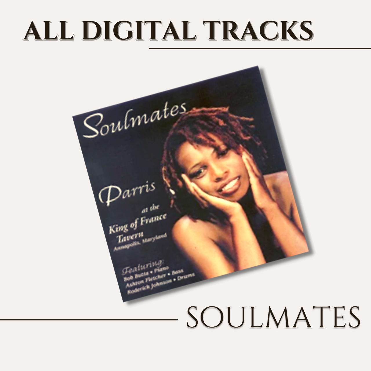 Soulmates is a live performance recorded on Valentine's Day at the historical Maryland Inn, King of France Tavern, Annapolis, MD. The CD consists of all of Parris' favorite love songs. Dubbed the trio from heaven, Parris is accompanied by Bob Butta on piano, Ashton Fletcher on bass, and Roderick Johnson on drums. The evening was full of love, and attendees included Grammy Award Winner, producer, and songwriter Skip Scarborough. Although the performance was initially recorded on a cassette for archive purposes through technology the spirit and sheer talent of this group shine through.
